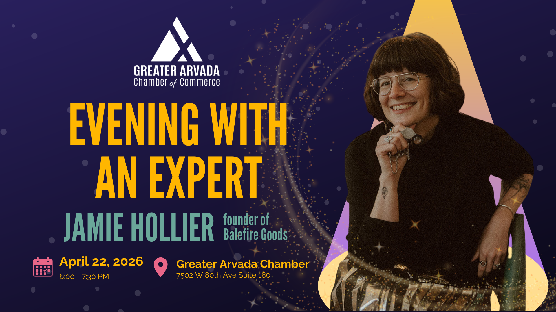 The Greater Arvada Chamber of Commerce is proud to welcome Jamie Hollier, founder of Balefire Goods, four-time entrepreneur, and the 2025 Arvada Chamber's own Business of the Year for a candid and inspiring conversation about building a business with heart.