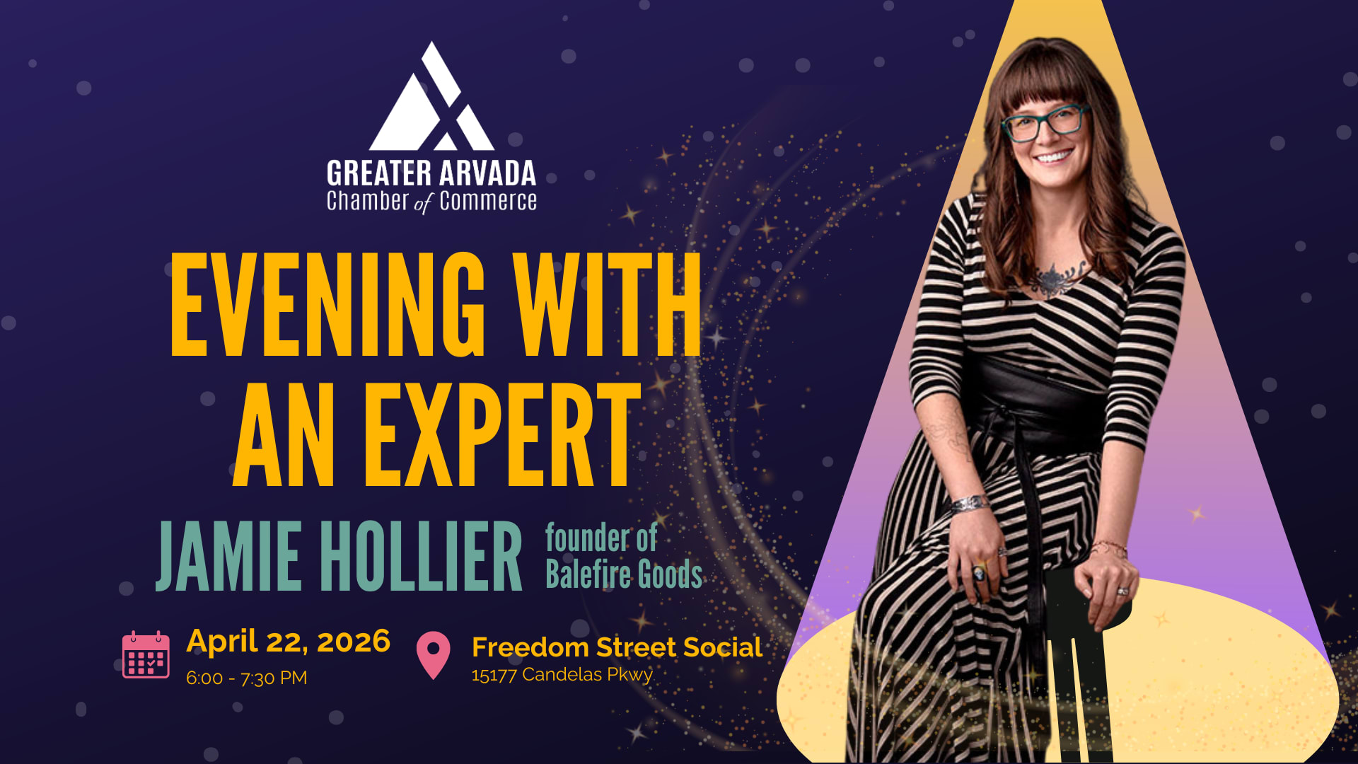 The Greater Arvada Chamber of Commerce is proud to welcome Jamie Hollier , founder of Balefire Goods, four-time entrepreneur, and the 2025 Arvada Chamber's own Business of the Year for a candid and inspiring conversation about building a business with heart.